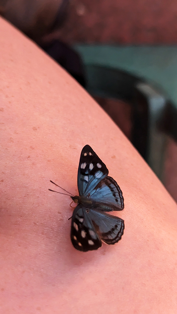 On the way out to the parking lot to meet up with our driver, one last blue butterfly landed on me and hitched a ride all the way to the taxi. I had to shake it off before we climbed into the car, and watched it flutter away through my window.