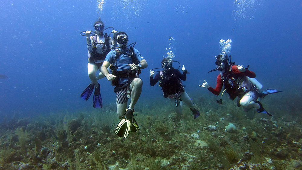 Josh had the day off, so Vince and I joined up with MJ, the instructor Bonnie and David had been working with. Once we got to our first dive site, the five of us descended together and stopped at a sandy bottom where Vince and I got to watch reef sharks cruise past us while MJ did a straight-line navigation skill with Bonnie and David.