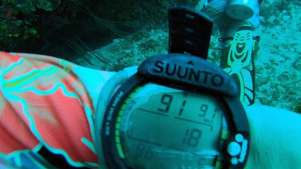 My dive computer showing a depth of 91 feet and a no decompression limit of 18 minutes at that depth.