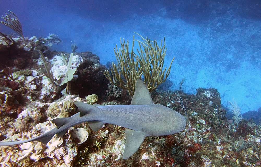 We slowly ascended back toward the surface, taking our time so that more nitrogen bubbles would dissolve out of our systems before we resurfaced. As we neared the end of the dive, we caught sight of a Caribbean reef shark, which glided gracefully through the water until it dissolved into the distant blue haze.