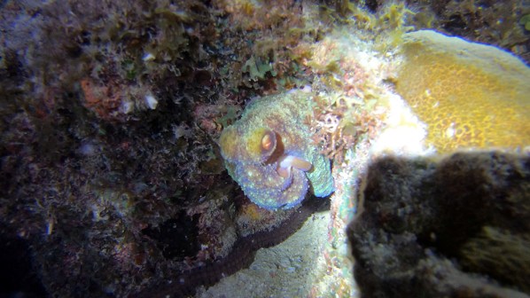 Unfortunately for the posing porcupinefish, I was quickly distracted by Esrom circling his light to signal he’d found something. I quickly abandoned the porcupinefish and swam over to join Esrom, who was aiming his light at a neon colored blob that had affixed itself to the underside of a rock. I squinted at it for a second before realizing it was an octopus!