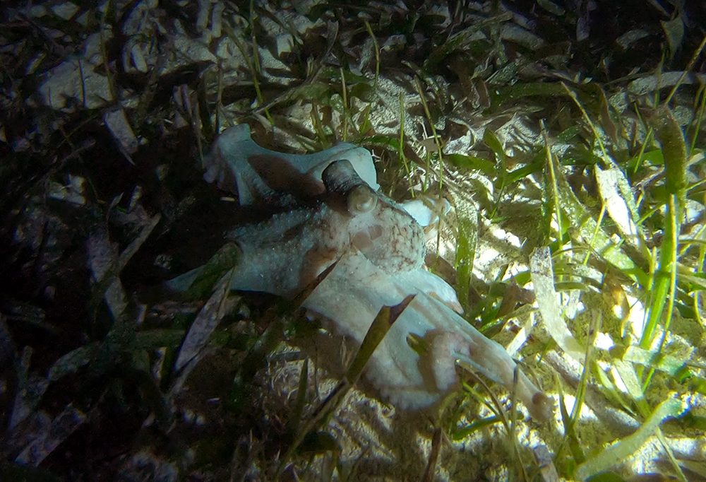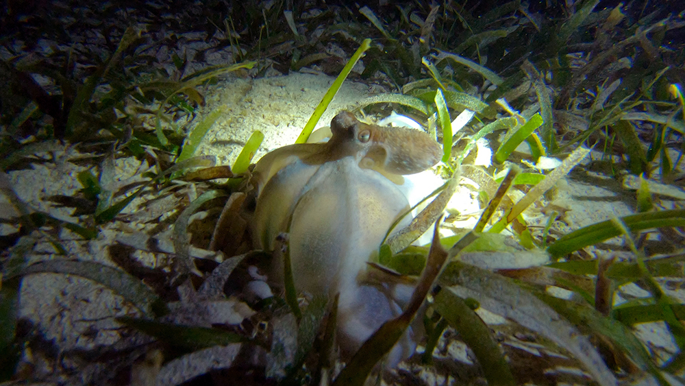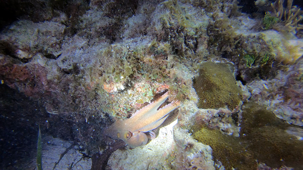 Eventually it slinked away, disappearing into a crevice, but the excitement wasn’t over because Esrom quickly managed to find another Octopus. This one was smaller and was displaying sandy colors, perfect for blending in with the ocean floor.