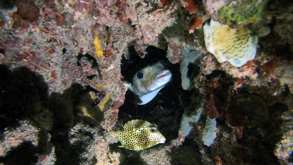 The dive was nearing an end after we left the final octopus, but we still spotted a few more neat critters along the way like this spotfin porcupinefish and spotted trunkfish hanging out together.