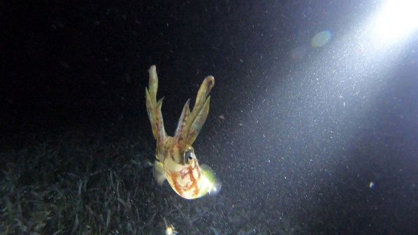 Dusky light was still filtering through the water when we rolled overboard, but before long, we were surrounded by darkness with only our lights to find our way. Tuffy Channel was a shallow dive site, which I was happy about because it meant we would have more time underwater to look for marine life.  Night time brings out a whole different array of creatures than what we had been seeing in the day, and I was hoping that we would be lucky enough to see an octopus.