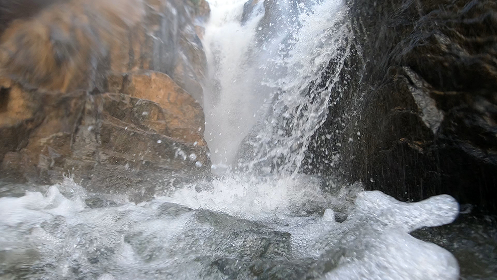 I wanted to swim up underneath the waterfall, but my first attempt failed because the current was so strong that I just was swept backward by the rushing water. Vince managed to figure out a method to get through the current that involved gracefully flopping himself onto a rock, and wiggling forward on his stomach. It seemed to work, so I followed him up, and soon I was underneath the falls with a deluge of water droplets clouding my vision.