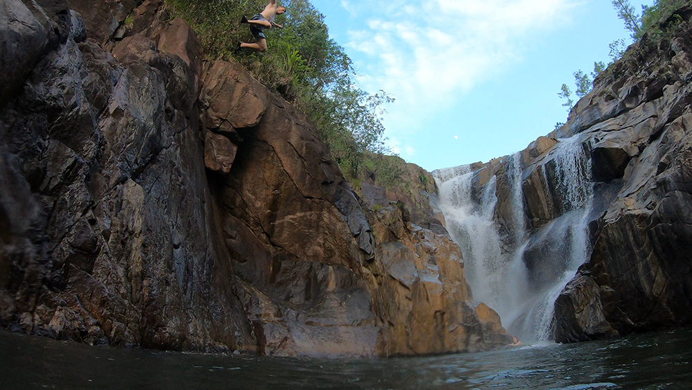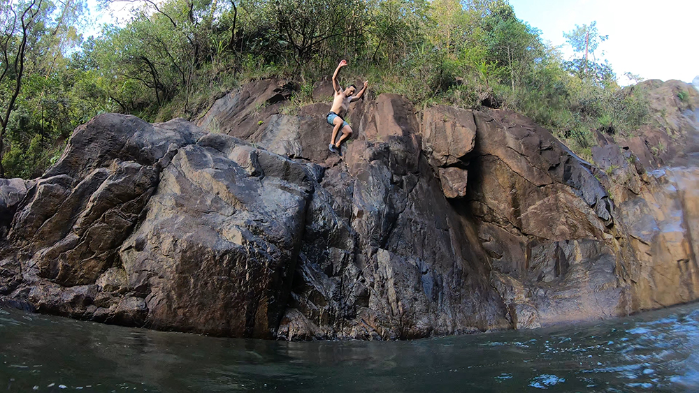 This pool ended up being a more exciting spot for cliff jumping. Too exciting (aka too tall) for me, but I was happy watching the others jump from a tall cliff, silhouetted in front of the dramatic waterfall.
