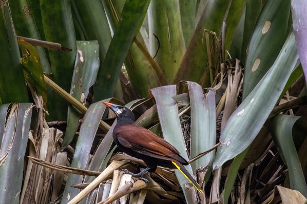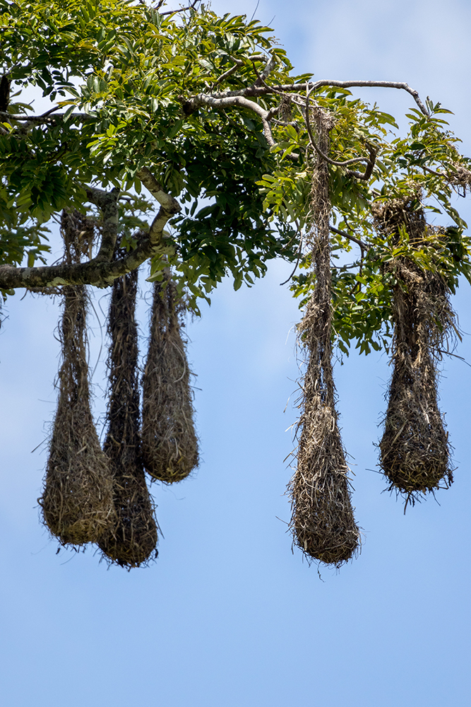 I was busy photographing tree roots when the others called me over to a small clearing that was bordered by tall, fruiting trees. The highest branches of one tree were rustling in a way that can only mean there’s an animal in them. My eyes followed the tall trunk upward until I spotted the culprit, a collared aracari. Then I noticed that there were a few more of the charming, tiny toucans eating berries from the tree’s branches. A shrill, bugling whistling sounded from a tree on the other side of the clearing, indicating the presence of another unique bird, an oropendola.