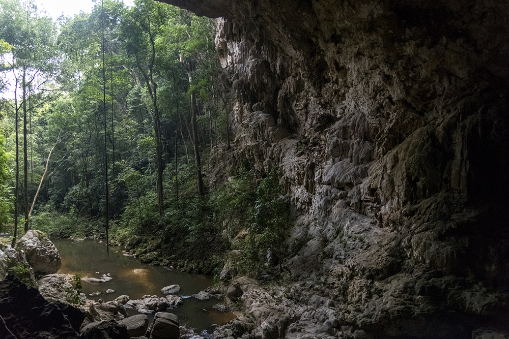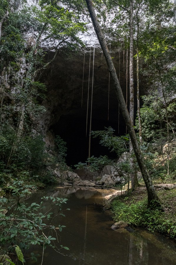 Vince steered the Jeep down a dirt road that was noticeably worse than the road to Caracol that we’d been warned about, parking at the bottom of a steep hill. We got out of the car and started walking, and within a couple of minutes, we were approaching the gaping mouth of Rio Frio Cave, one of the most well-known points of interest in Mountain Pine Ridge. Despite the cave’s apparent popularity, as evidenced by a stampede of footprints on the sandy trail that led to it, we once again were completely alone.