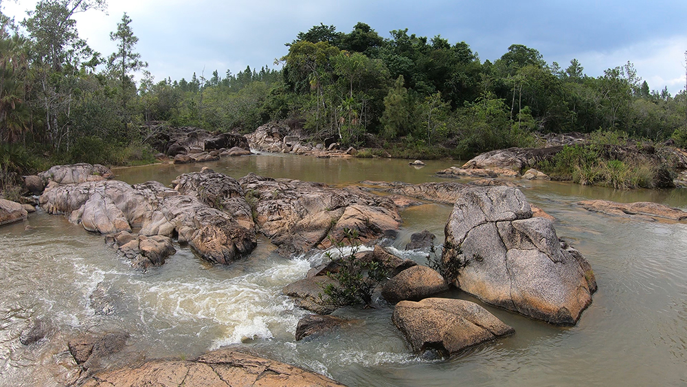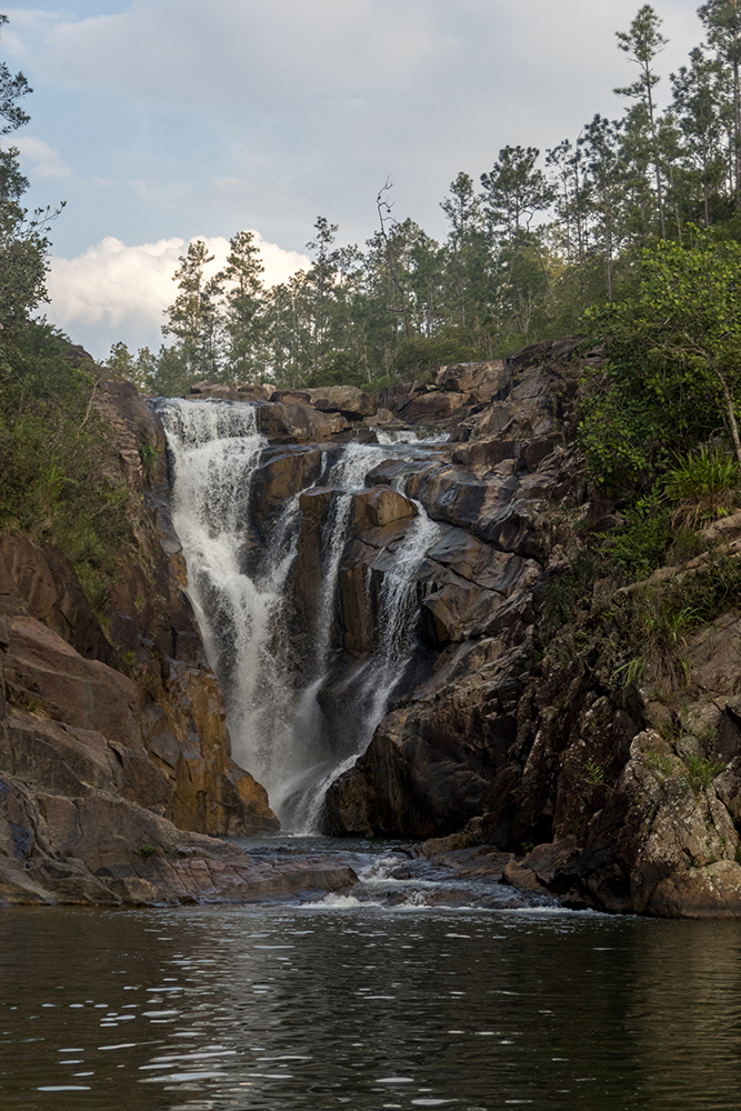 A combination of swimming, climbing, and hopping from boulder to boulder got us back to the trail where the crowd of bathers had thinned dramatically. We hiked back up to the Jeep, leaving our bathing suits on for the short drive to our final stop of the day, Big Rock Falls. Minutes later we were descending a ramshackle staircase through the pine forest. I tried not to think about how we would have to climb back up that staircase again (my legs were still suffering from all of the Mayan architecture) as we stepped out onto another rocky embankment.