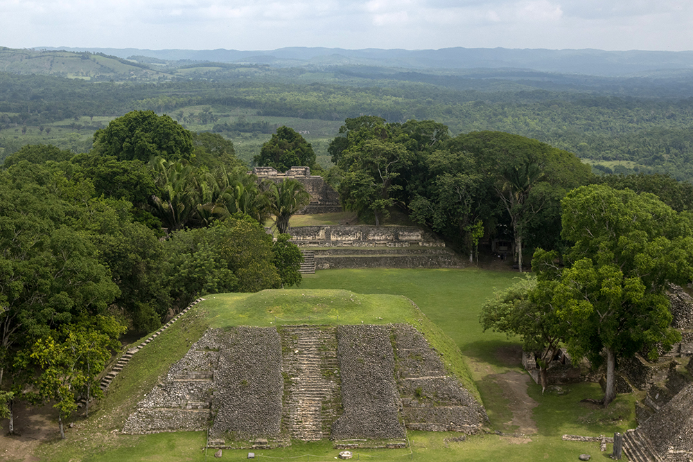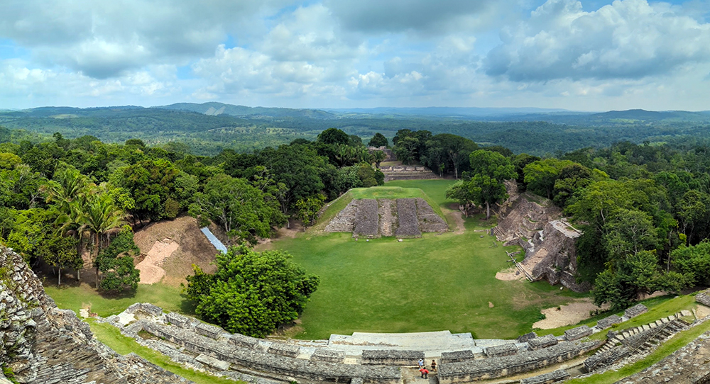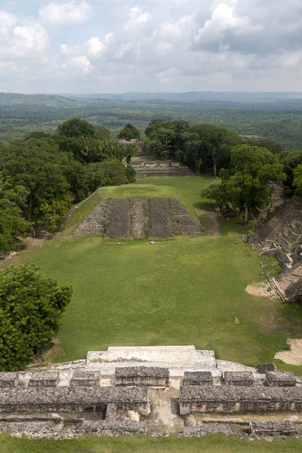 Miles of green canopy spread out below us in every direction. A glinting, white roadway cut a path through the trees to the east, marking the Guatemalan border. We strode to the front of the temple to look at the view of the rest of the site, which now looked tiny compared to our vantage point in the clouds.