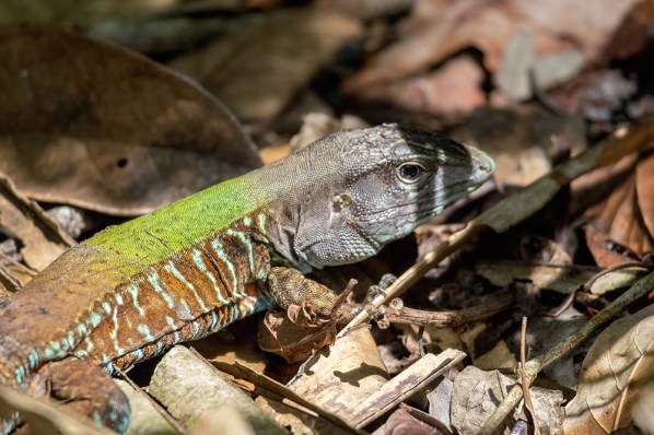 I’m not going to sugarcoat it. This hike was a slog. The combination of the elevation gain and the extreme heat made for a somewhat miserable uphill battle, but the trek was punctuated every now and then by cool discoveries. We found the skull and spine of an animal we couldn’t identify, heard some howler monkeys roaring persistently far off in the distance (it’s amazing how far their voices travel), and spotted this gorgeous Ameiva lizard.