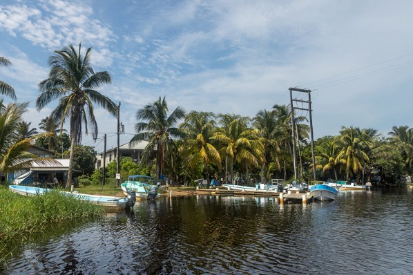 When we exited the swamp, we emerged into the gaping mouth of Monkey River. A distinct line formed where the black water of the river met with the salty, green sea. Nestled amongst tall palms on the water’s edge, were a few buildings that belonged to the village of Monkey River. We made a quick stop to place our lunch orders at a small restaurant, and then picked up a local guide named Raymond. Raymond would help us spot wildlife as we cruised upriver, and would provide us with information about the local history and ecology.