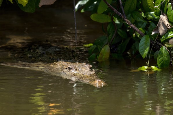 Then, Raymond pointed to something floating beneath a tangle of branches that hung over the river’s edge. I squinted until a brown shape emerged from the shadows, its orb-like eyes protruding from the water. It was a crocodile! This was one of the species I most hoped to see during the tour because it was from the only family of American crocodilian that I had yet to see in the wild. I’d seen American Alligators in the swamps of Louisiana, and black caiman deep in the Peruvian Amazon, but this was my first time seeing any of the four species of crocodile that live in the Americas. This individual could have been one of two species of crocodile found in Belize, the American or the Morelet’s crocodile, but I think it looked a bit more like an American crocodile (in my completely non-expert opinion).