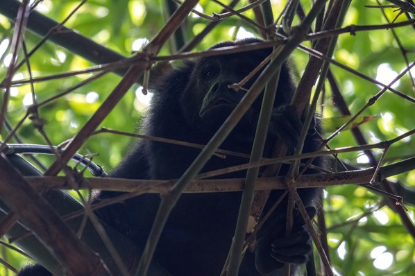 Just then, the loud roar of a howler monkey echoed from a nearby treetop. Raymond motioned for us to approach a sprawling tree with a girthy trunk, and branches that hung low to form what felt like a natural shelter in the middle of the forest. A pair of howler monkeys stared down at us from the branches, backlit in the late morning light that penetrated between the thick jungle canopy. I snapped a few pictures, but the lightning conditions made it impossible for me to get anything amazing, so eventually I gave up and just watched the monkeys until Raymond led us away from the tree.