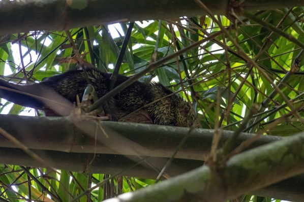 Emerging from the copse of bamboo was a return to the familiar, and just on the other side of it, Raymond pointed up to a tree branch where he knew a porcupine lived. This was a Mexican tree porcupine, much different from the North American porcupines I am used to at home in Michigan. It was not at all interested in giving us a look at its face, but we got to see its spiky quills as it walked across the branch far above our heads.