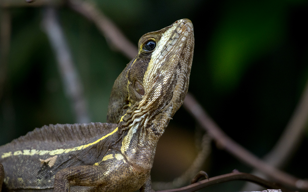 A short time late, we slowed again and Raymond pointed to what would be the most surprising highlight of the tour for me. There was a small lizard perched on a tree branch overhanging the water, with its nose pointed obstinately to the sky. Raymond said it was a Basilisk Lizard, also known as the “Jesus Lizard” because it has the peculiar ability to run on top of water for distances of about thirty to sixty feet. I’m not sure that the little reptile realized we had spotted it, because it stood completely still, even when the captain maneuvered the boat right alongside it for a closer look. The creature relied on its natural camouflage rather than fleeing, which gave us the incredible opportunity to observe it right down to its intricately patterned scales.