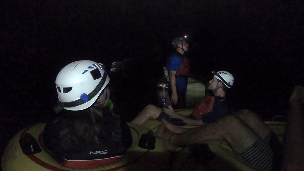 When we stepped onto solid ground on the far side of the bridge, we found a large stack of yellow river tubes. We each selected a tube and put on life vests, and then our guide lashed the tubes together to form a four-person raft. The four of us climbed into our tubes, happy to get some refreshment from the cool water, and our guide waded into the river and swam alongside us as we floated towards the gaping mouth of a water-filled cave.