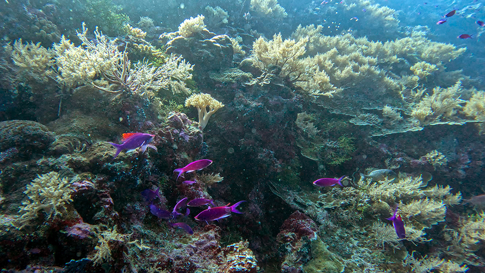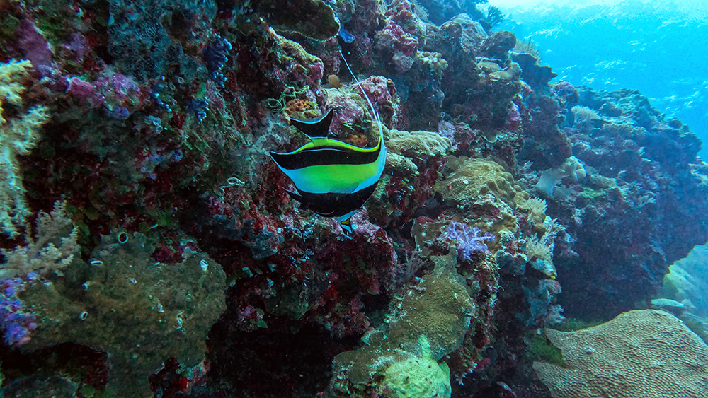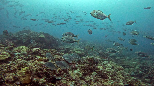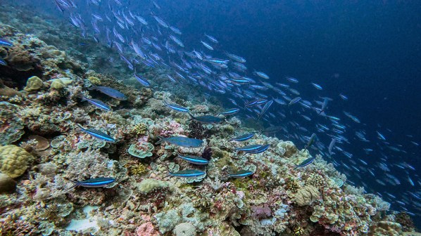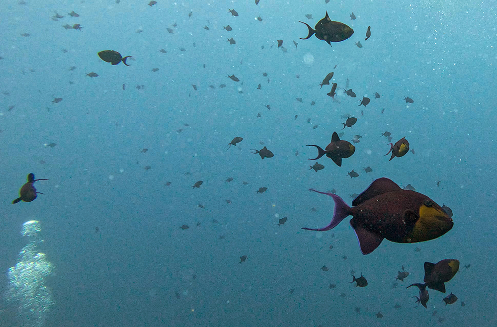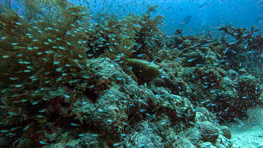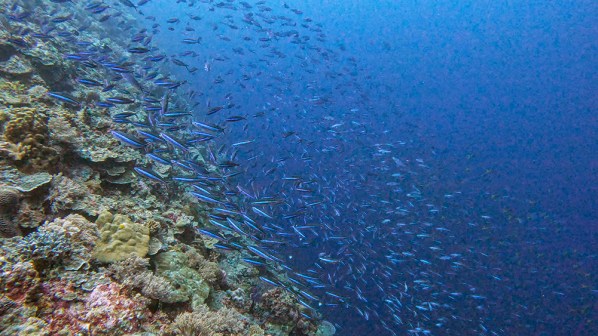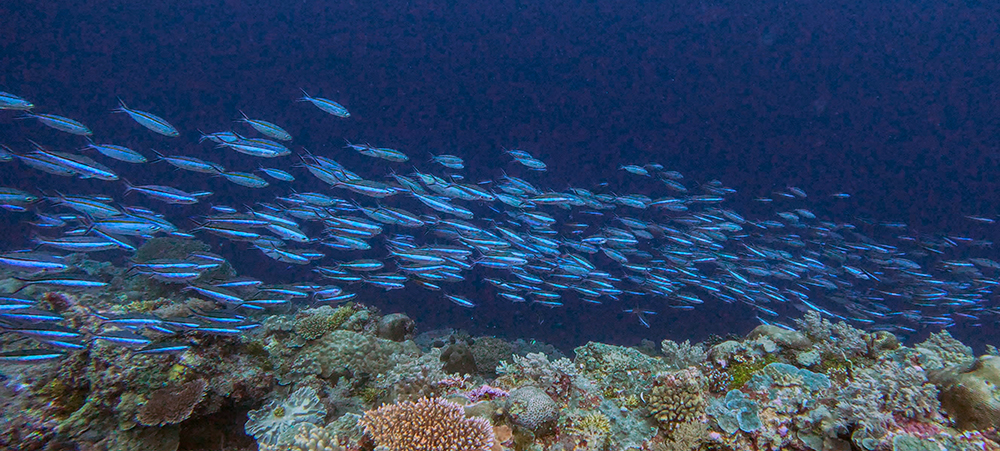 The first thing I noticed besides the water condition was the fish. Thousands upon thousands of shiny fusiliers flowed around us as we drifted along the reef. Tomi partially inflated his SMB and dragged it through the water in erratic patterns to make the schools of fish dart around together in reaction to it. The result was a dazzling display of twinkling bodies, moving in tandem in every direction I looked.