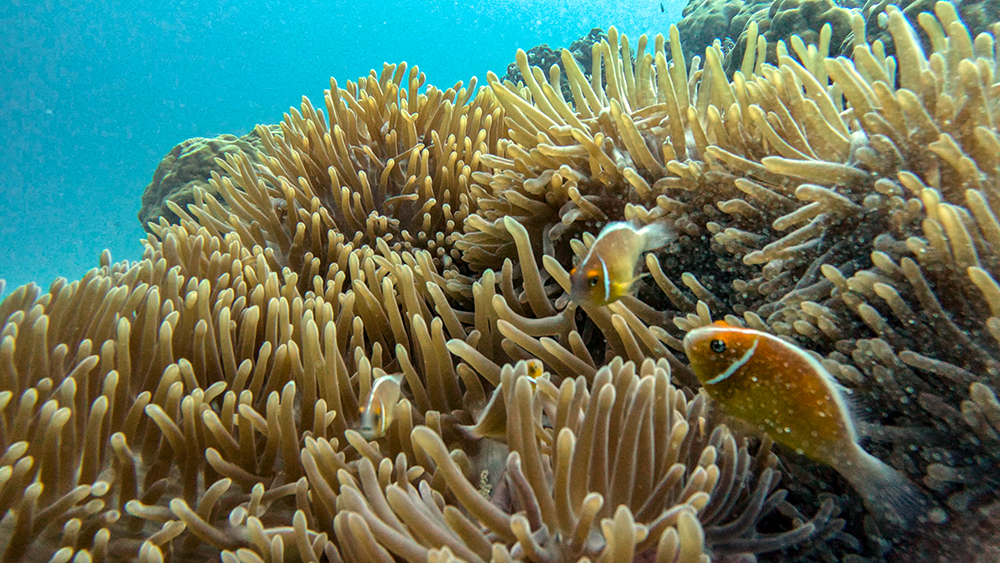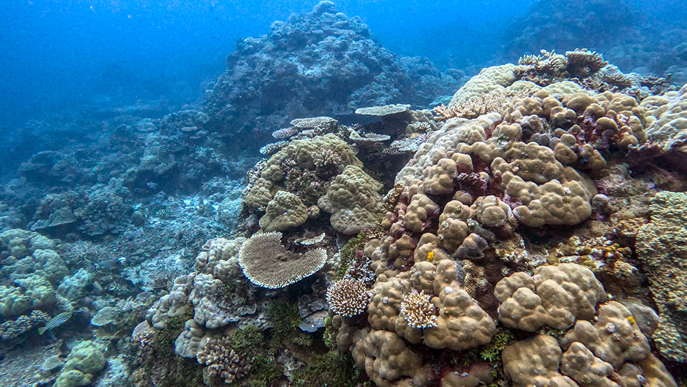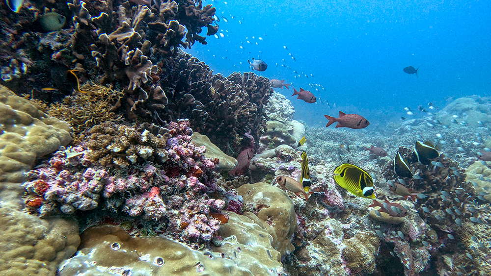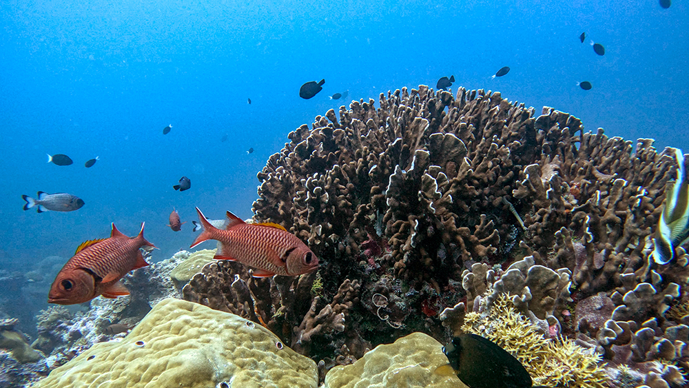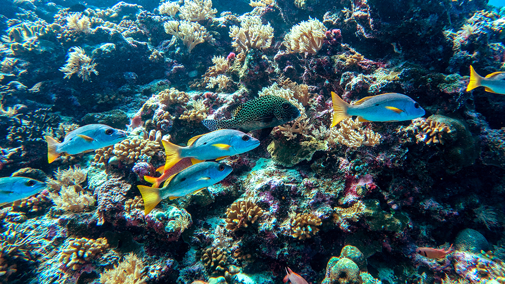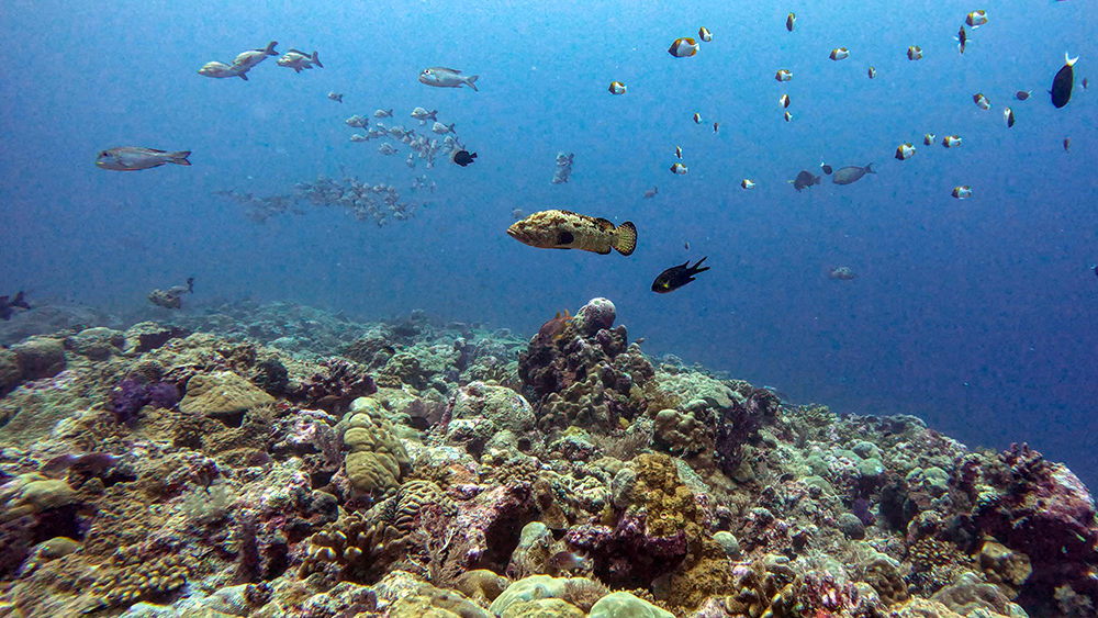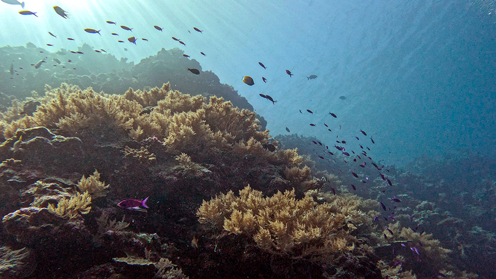 The first thing I noticed besides the water condition was the fish. Thousands upon thousands of shiny fusiliers flowed around us as we drifted along the reef. Tomi partially inflated his SMB and dragged it through the water in erratic patterns to make the schools of fish dart around together in reaction to it. The result was a dazzling display of twinkling bodies, moving in tandem in every direction I looked.