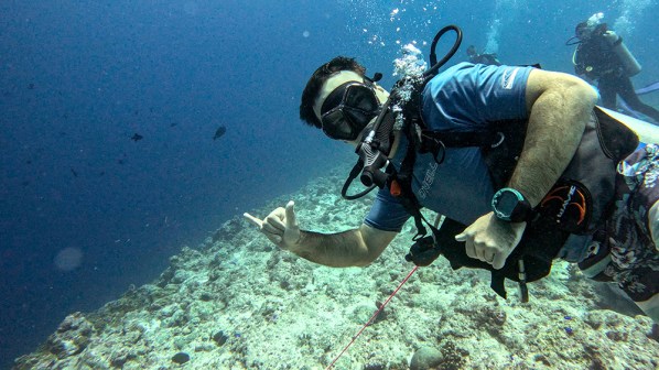 Since the sharks were already out in force, Tomi found an open spot on the reef and signaled for us to take out our reef hooks. Following his instructions from the briefing, I retrieved my hook, which was attached to a daisy-chained length of rope, from my BCD pocket. I found a solid looking bit of rock on the sea floor, secured my hook into it, and then inflated my BCD. The added air in my BCD caused me to float upwards until I hit the end of the rope and it was pulled taught. Floating there like a kite, I looked over to Vince who had also successfully hooked the reef. Now we were both ready to relax and enjoy the show.