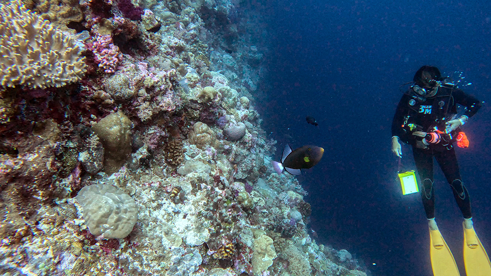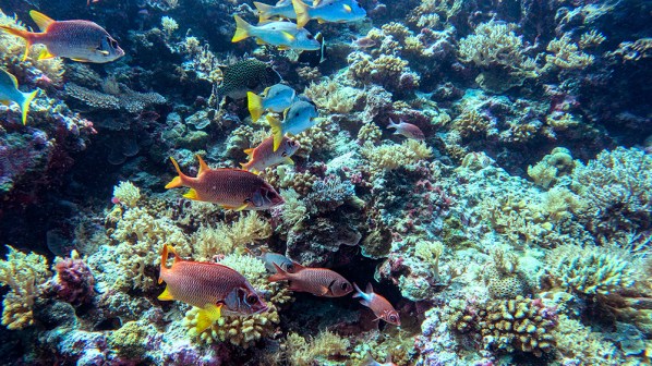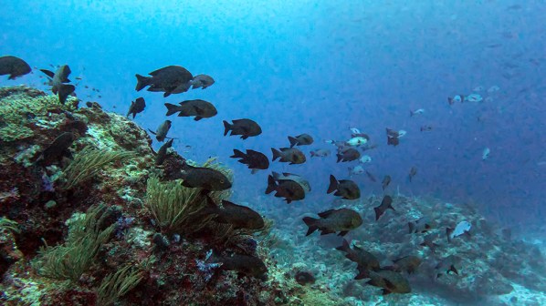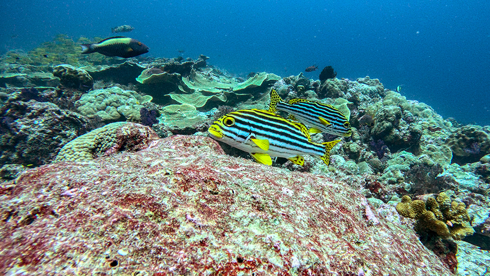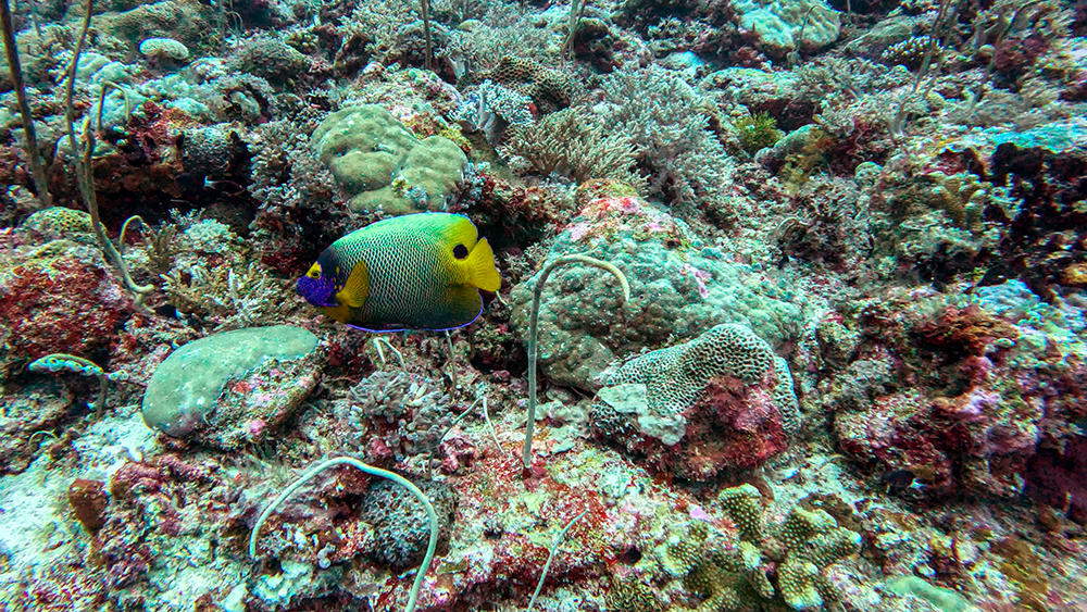 The current was ripping when we rolled into the water. We descended to a bottom that was covered in lace-like, yellow coral, and then followed Tomi, swimming with the current until we found the snappers.