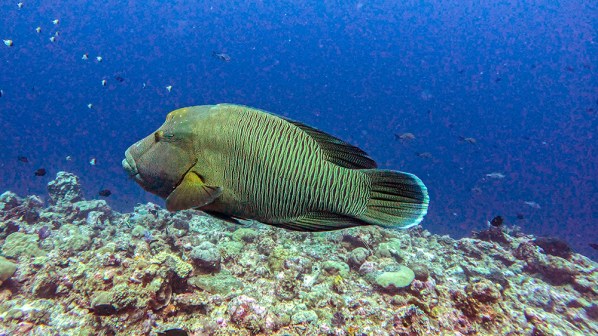 Finally I got a close encounter with one of the main species I’d been hoping to see on this dive, a Napoleon wrasse. These colorful giants are an endangered species, and can grow up to six feet long (although most won’t get that big). I swam over to get a better look at the wrasse, and to my delight, it veered toward and passed just a few feet in front of where I was floating.