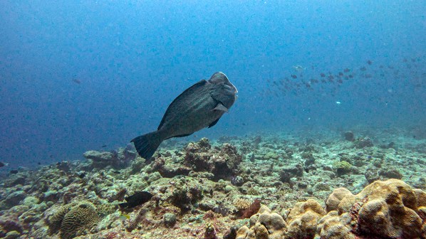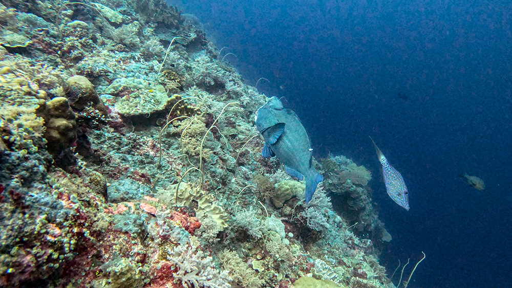We got to float and watch the sharks swim by for several minutes before Tomi signaled for us to unhook and follow him up away from the drop-off. We still had plenty of time left to search for other interesting creatures before returning to the surface. There was, of course, a school of barracuda, a sight that was becoming commonplace at this point. I also got quite close to a bumphead parrotfish. This is one of my favorite fish species. It’s hard to tell without a human in the photo for reference, but bumpheads are quite large. They can grow up to five feet in length and weigh up to 165 pounds!