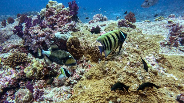 A short while later, I spotted a titan triggerfish, Moorish idol, sixbar angelfish, scrawled filefish, and blueface angelfish all gathered in one place.
