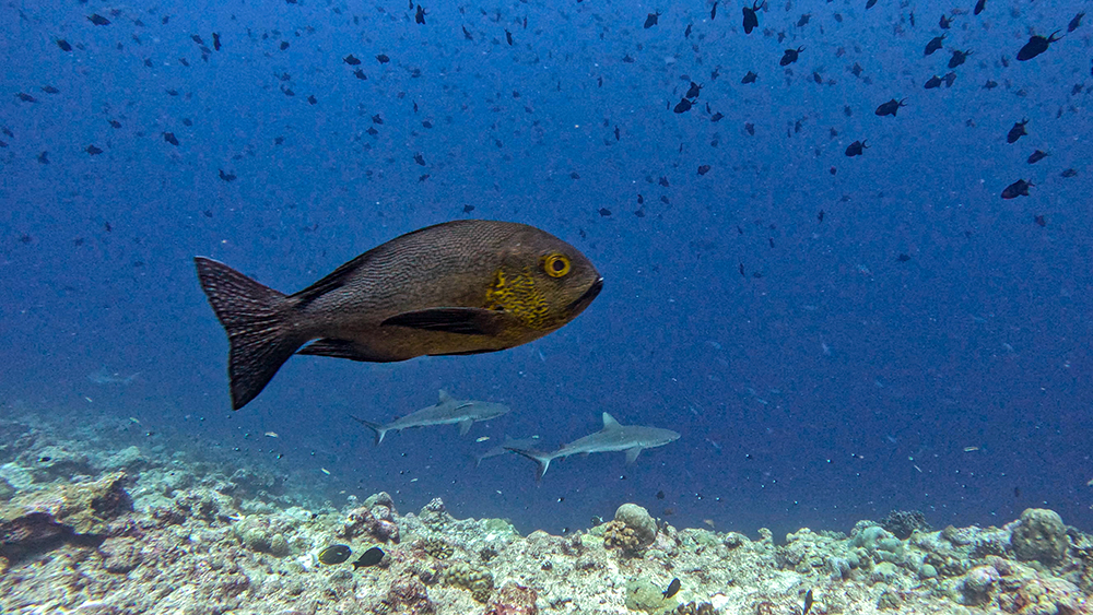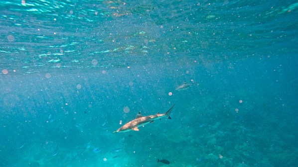 And the fusiliers weren’t the only interesting fish we saw. There were more barracudas and snappers, another bumphead parrotfish, and a school of jacks. I was momentarily stunned when a whitetip reef shark sped toward us from the blue haze, attacked a snapper, and vanished back into the depths as quickly as it had appeared. It was somewhat sobering to see how fast the shark could move when it was on the attack. I’ve seen a fair number of sharks underwater at this point. All of them have been either laid-back, cruising through the water and minding their own business, or harmlessly curious, checking out our group of divers, but never making any sudden movements to rush towards us. This shark came out of nowhere and was so fast I could have completely missed it if I didn’t happen to be looking in the right direction at the time. It was my first time watching a shark hunting, and the animal’s speed and power was breathtaking.