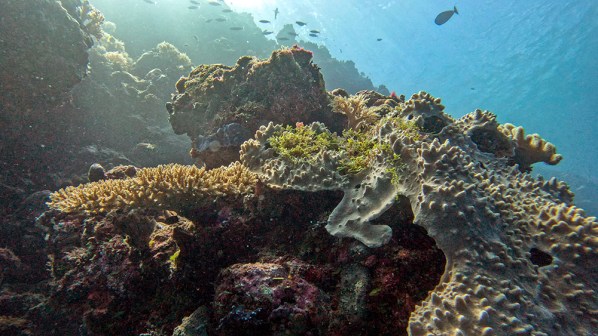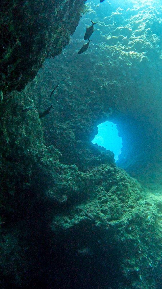 We explored the cavern for about half of the dive, then reemerged onto the reef. Visibility was indeed greatly improved from the previous day. The reef itself looked vibrant, and the colors of the reef fish seemed much brighter as well. We swam along a wall that was covered in lush coral that glowed from the backlight of the sun filtering through the water.