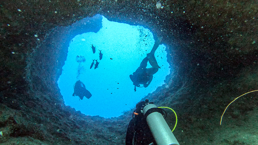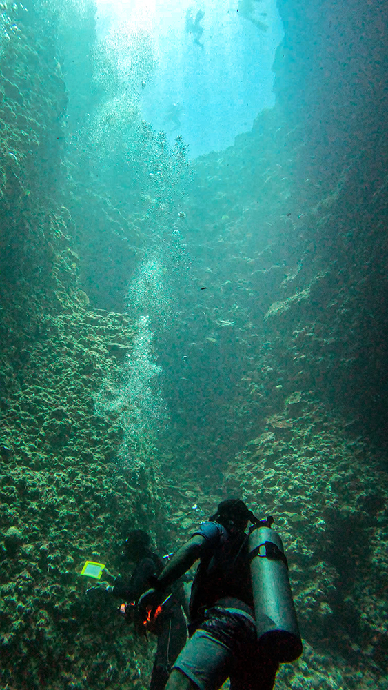 Sunny skies also meant that the visibility underwater should be better that day, and I was so excited when we finally rolled into the sea at one of Palau’s most famous dive sites, the Blue Holes. This was me and Vince’s 50th dive, and it was a wonderful spot to mark the occasion. The Blue Holes gets its name because the main attraction of the dive is to swim through giant holes in the seabed, and into and underwater cavern. Once we reached depth, we entered one of the eponymous holes, and swam into another world where ethereal beams of light pierced the darkness to illuminate patches of the rocky cavern.