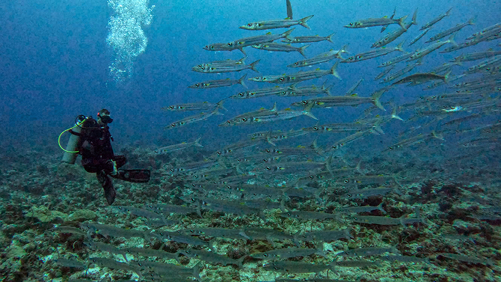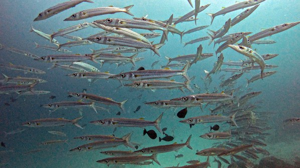 I love the way barracudas catch the light and look like they are shimmering when they gather in large groups, so I was happy when we got to spend the rest of the dive swimming along with the school.