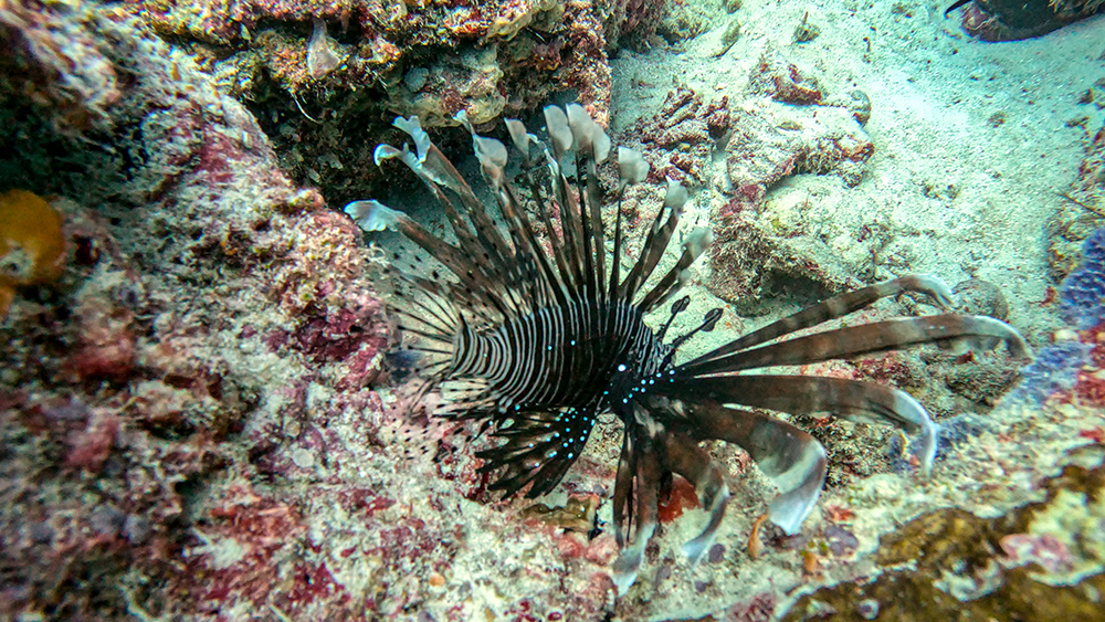 After that, the dive was full of smaller, although still beautiful, fish. We saw a moray eel, a lionfish, and more leopard sweetlips. Then we got to see one last school of barracuda before returning to the surface for the last time.