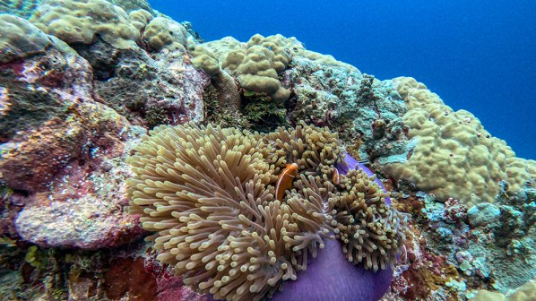 The eel garden was the turning point for the dive, and after watching them for a few minutes, we started to fin back in the direction of the boat. On the return trip we spotted a perfect anemone with a pair of clownfish living in it, and I found a large moray eel hiding in a rock. I tried to show everyone else, but couldn’t get their attention.