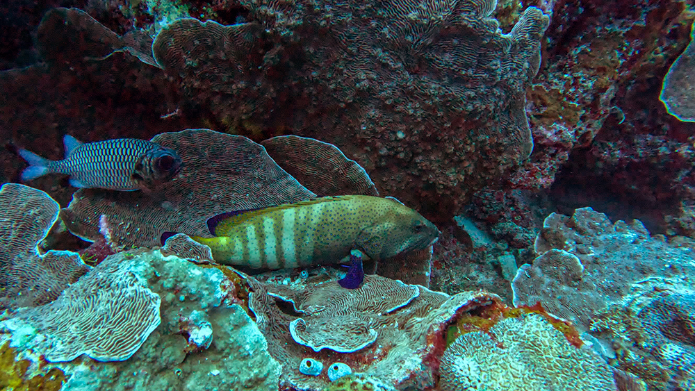 Along the way, we encountered scores of vibrant reef fish, including leopard sweetlips, squirrelfish and common snappers, and a blotched fairy basslet and some other anthias.