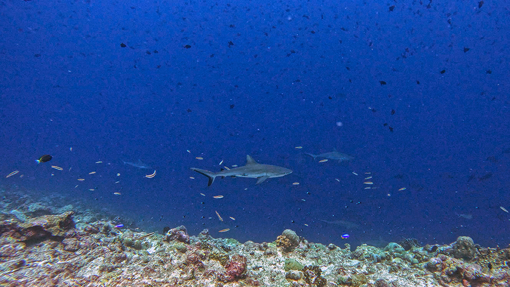 And the fusiliers weren’t the only interesting fish we saw. There were more barracudas and snappers, another bumphead parrotfish, and a school of jacks. I was momentarily stunned when a whitetip reef shark sped toward us from the blue haze, attacked a snapper, and vanished back into the depths as quickly as it had appeared. It was somewhat sobering to see how fast the shark could move when it was on the attack. I’ve seen a fair number of sharks underwater at this point. All of them have been either laid-back, cruising through the water and minding their own business, or harmlessly curious, checking out our group of divers, but never making any sudden movements to rush towards us. This shark came out of nowhere and was so fast I could have completely missed it if I didn’t happen to be looking in the right direction at the time. It was my first time watching a shark hunting, and the animal’s speed and power was breathtaking.