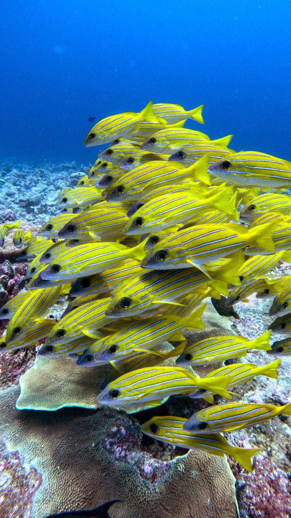 The current was ripping when we rolled into the water. We descended to a bottom that was covered in lace-like, yellow coral, and then followed Tomi, swimming with the current until we found the snappers.