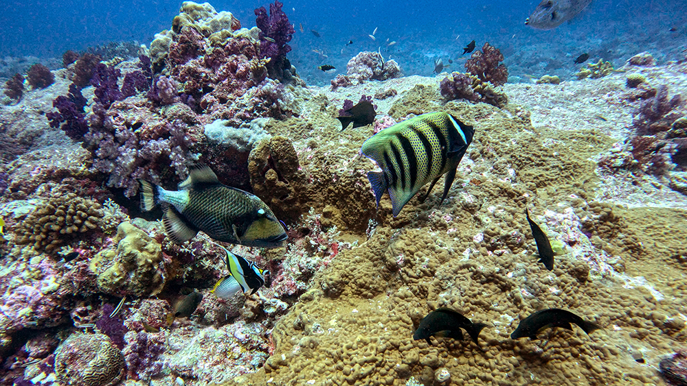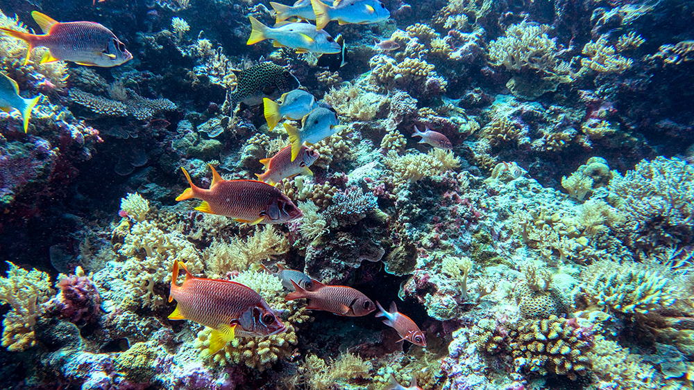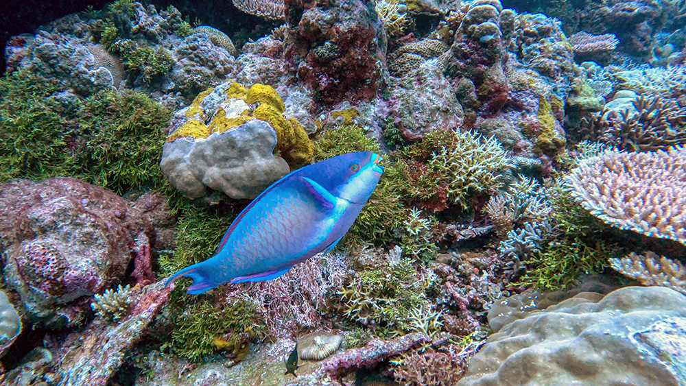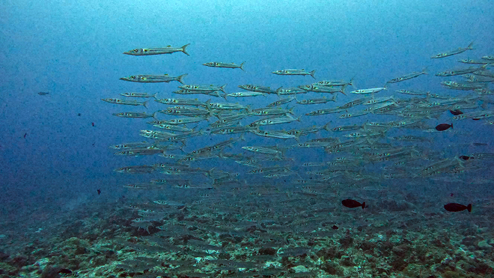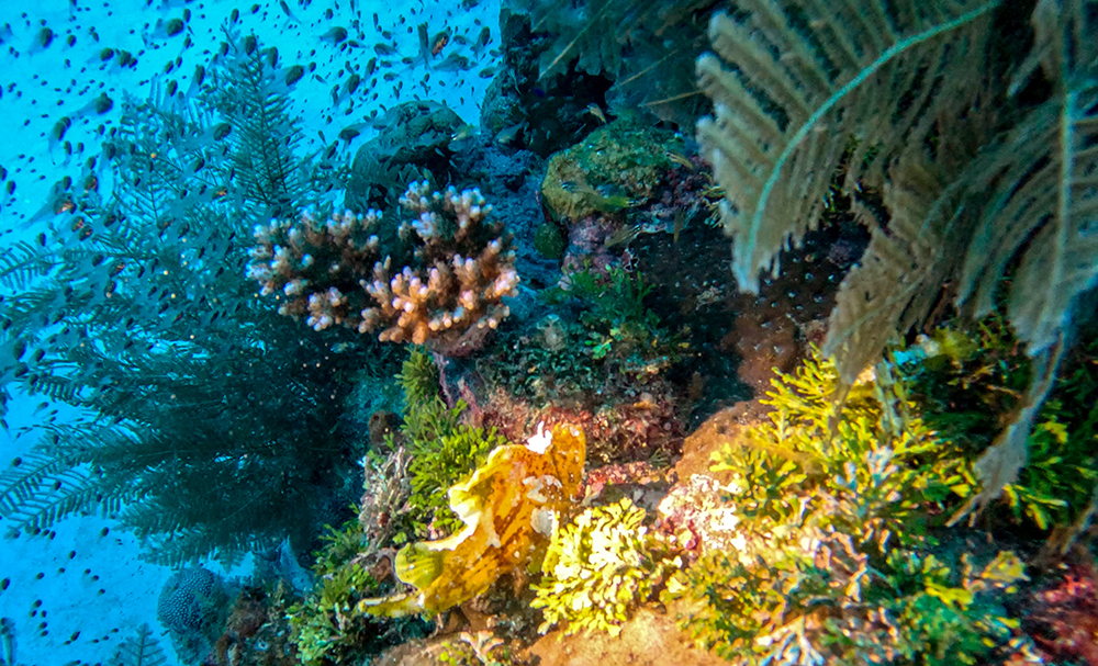 The first thing I noticed besides the water condition was the fish. Thousands upon thousands of shiny fusiliers flowed around us as we drifted along the reef. Tomi partially inflated his SMB and dragged it through the water in erratic patterns to make the schools of fish dart around together in reaction to it. The result was a dazzling display of twinkling bodies, moving in tandem in every direction I looked.