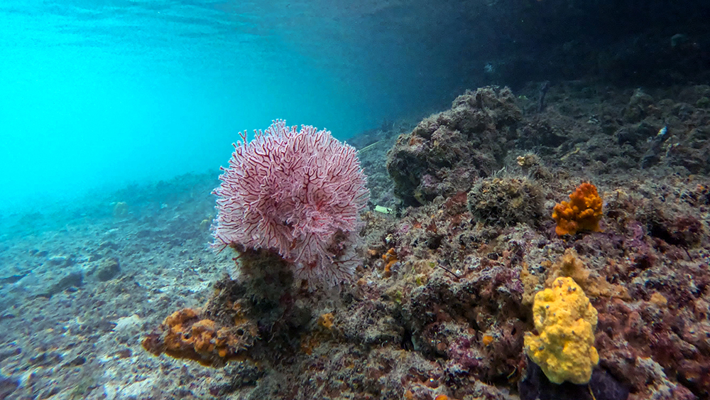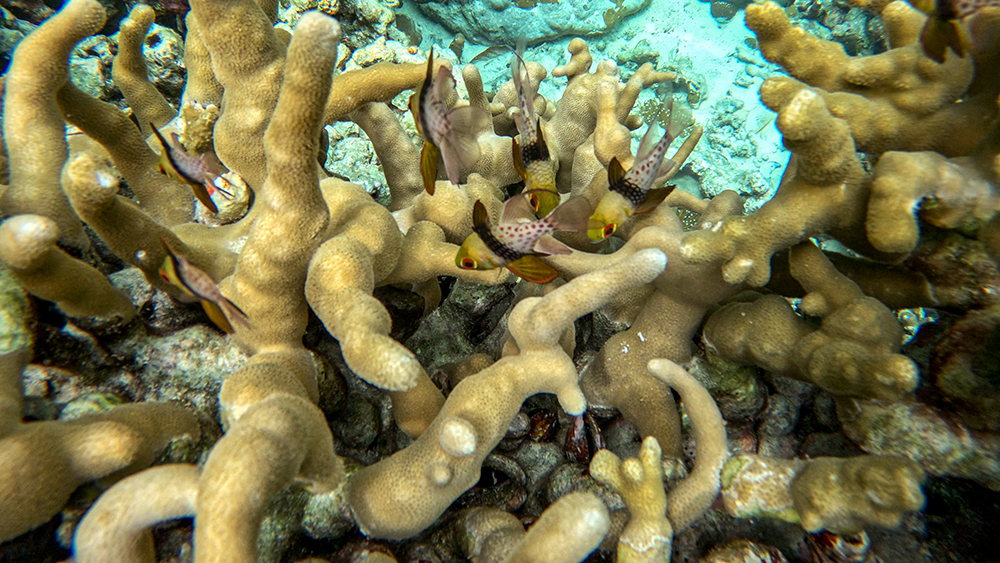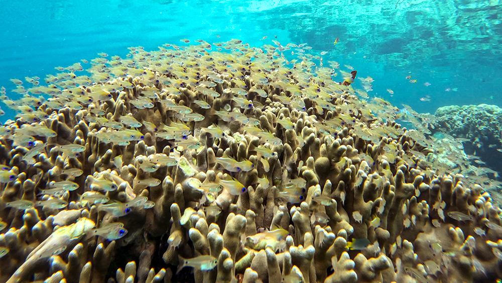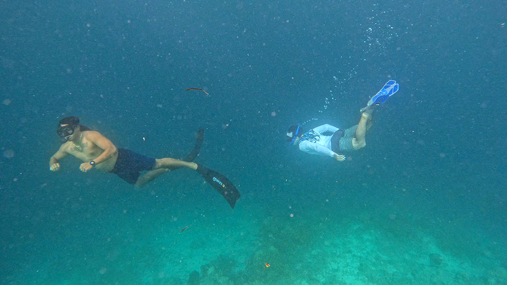 Everyone’s heads were panning around in awe at the crystalline lagoon. I tried to absorb every last detail of the scene as Finn showed us the source of the flowing spring water that had created the natural aquarium. He pointed to different areas of the bay, detailing the best places to look for Mandarin Fish. He also pulled out a picture of another colorful species, the Pajama Cardinalfish, and told us to look for them on branching corals. Then we paddled back to the speed boat, left our kayaks with RD, and pulled on our snorkeling gear again.