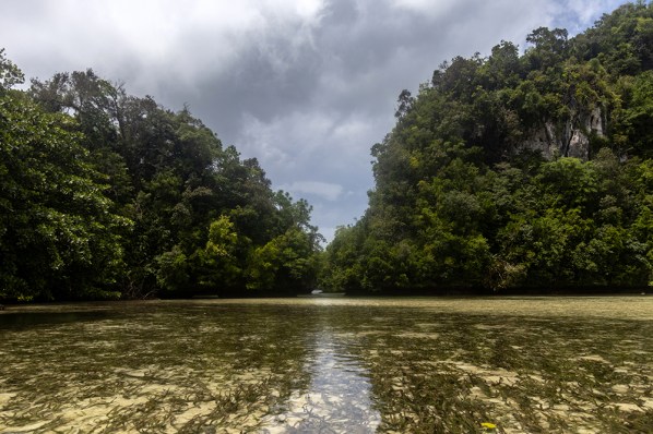 I was still pinching myself, trying to believe that we were actually in Palau, the top country on my travel wish list for about a decade, as we paddled toward a long tunnel at the base of one of the limestone islands. The cave served as a gateway to a shallow bay where juvenile blacktip reef sharks grow, safe from the predators of the open ocean. We propelled our kayaks into the tunnel, and were forced to lean backwards so our heads wouldn’t scrape against the rocky ceiling. When we were through, we found ourselves in a much shallower bay with brown seaweed flowing below us. The bay was fringed by a thicket of mangrove trees, and this is where we began our search for the baby sharks. Nobody made a sound as we peered into the shallow water, trying our best not to scare the notoriously shy creatures. Our efforts turned out to be in vain, and we had to move on. There may not be any blacktips for us to see, but there were still lots of items on the day’s agenda, and we had to time everything in accordance with the tide.