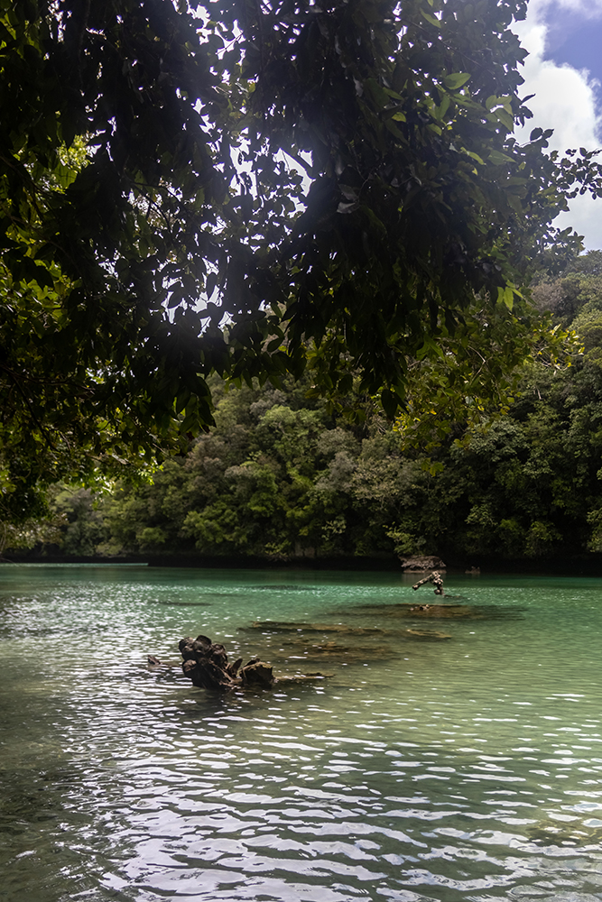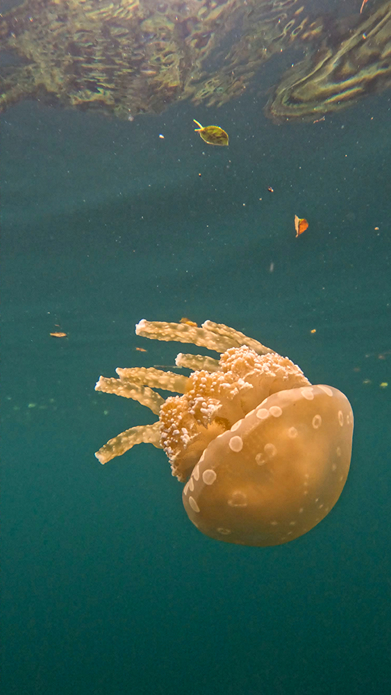 In fact, the lake where the Golden Jellies live is one of the main tourist attractions in Palau. Until 2019, millions of jellyfish floated in the lake’s waters, until a La Niña made the water too warm for them, and caused them to reproduce in smaller numbers than usual. I’ll go more in depth on the Golden Jellies in my next post about our visit to the Jellyfish Lake. The reason I’m mentioning them now is because Finn was looking for a good spot for us to swim with the Mastigias Papuas. Since we wouldn’t get to see the lake at max occupancy, he wanted to make sure that we got to swim with Palau’s other stingless jelly to make up for it.