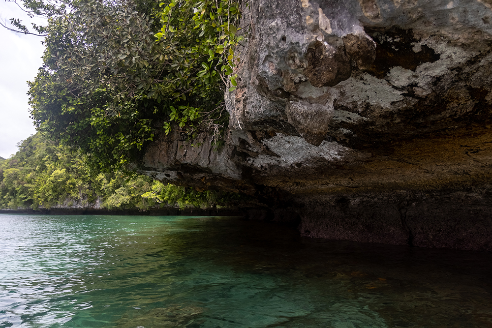 Our subdued mood dissipated as we resumed our paddle, exiting the protected bay to travel along the outside of a large island. Sea birds swooped and glided above the ocean’s surface around our boats, and Finn stopped to point out a rock covered in Chitons (mollusks that look like they are wearing tiny suits of armor). We pulled up closer and watched them move, ever so slightly, atop the jagged limestone. Then we cruised along underneath an overhanging cliff with scraggly tree branches spilling over its edge, until we rounded into another protected bay. RD was there waiting for us with the speedboat, but we still had one more bay to explore before it was time to board the boat and return to Koror.