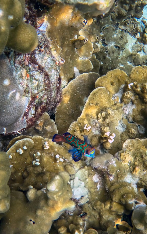 Soon we realized that the day was waning and it was almost time to return to Koror. The problem with this was that none of us had found a Mandarin Fish yet. All five of us fanned out to do one last sweep of the lake, and miraculously, Rachel managed to spot one! She excitedly called everyone over, and pointed to a hole where the Mandarin Fish had hidden. With bated breath, we all hovered in place over a large coral, waiting for it to reemerge. After a couple of minutes, a tiny, oddly shaped fish in hues of sapphire blue, cadmium red, and emerald green hovered into view.