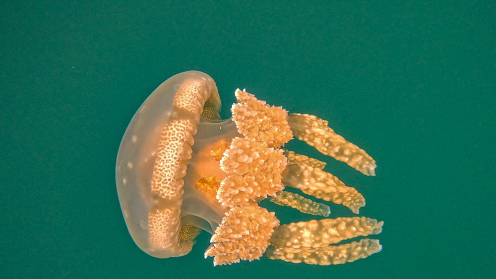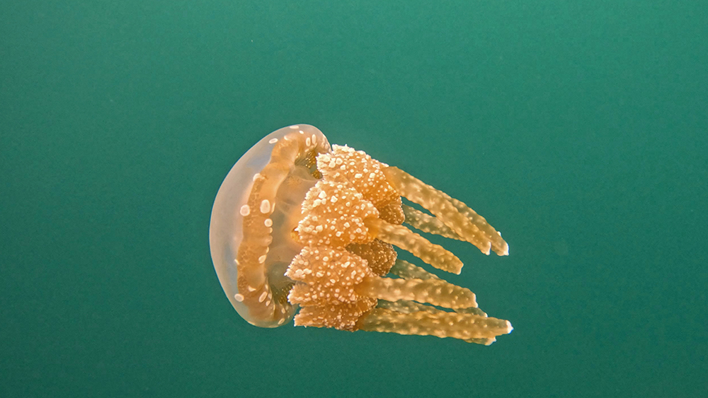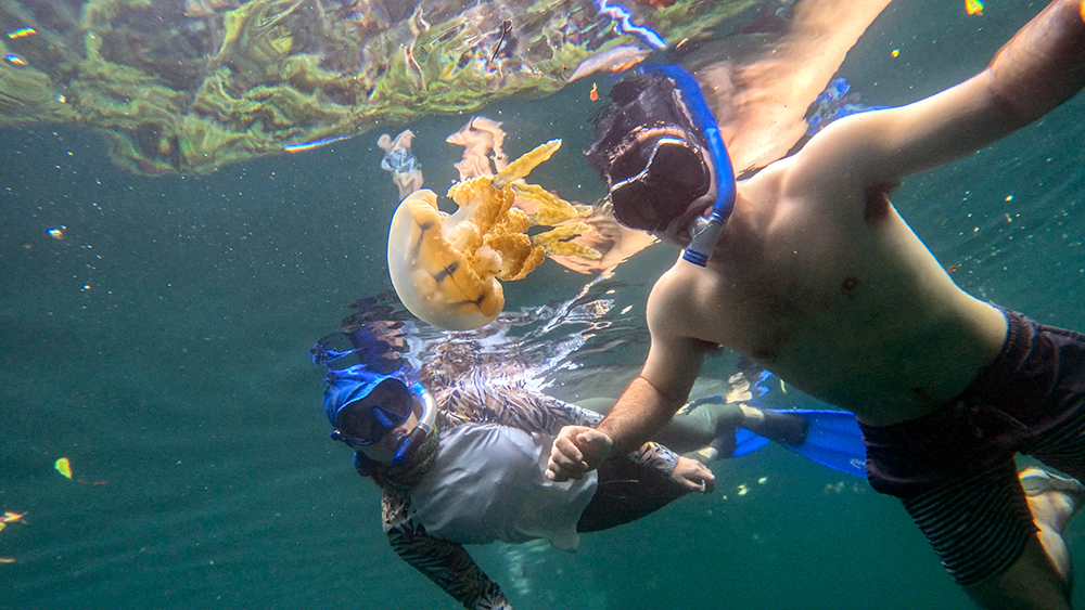 Once we started seeing the bobbing forms of the jellies with some frequency, Finn told us we could put on our snorkel gear and get in the water. I pulled on my mask, snorkel, and fins, and slid over the side of me and Vince’s tandem kayak into the refreshing lagoon. All around me, the tentacled forms of jellies floated up and down, as though they set to move on half speed while the rest of the world continued on at a normal pace. The milky lagoon water looked like an infinite, green abyss, with no discernible bottom or sides, adding to the illusion that the jellies were living in suspended animation.