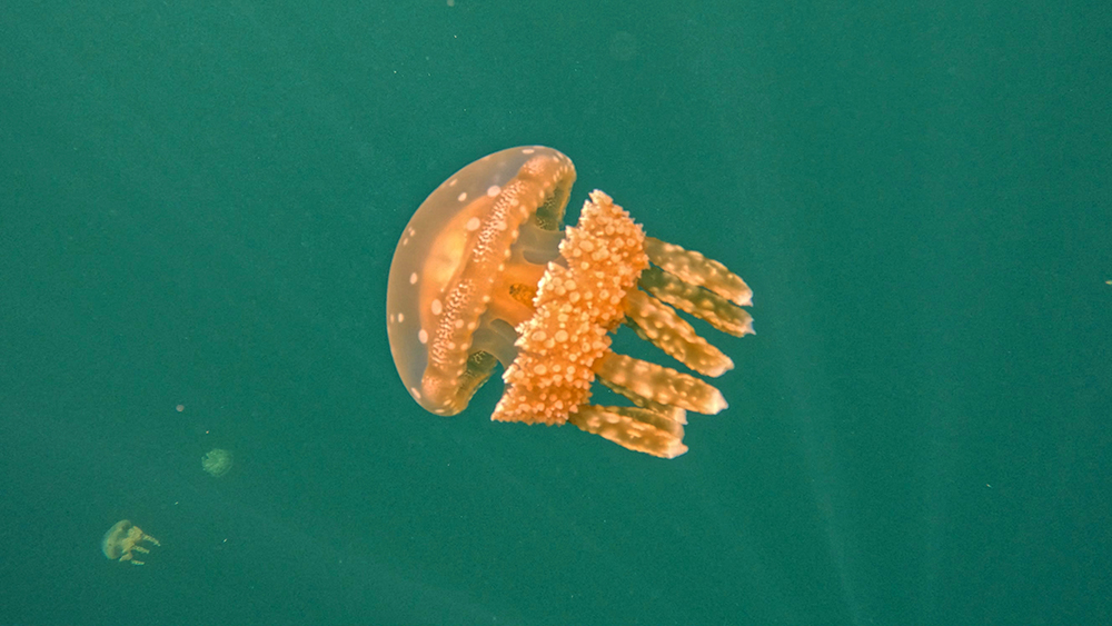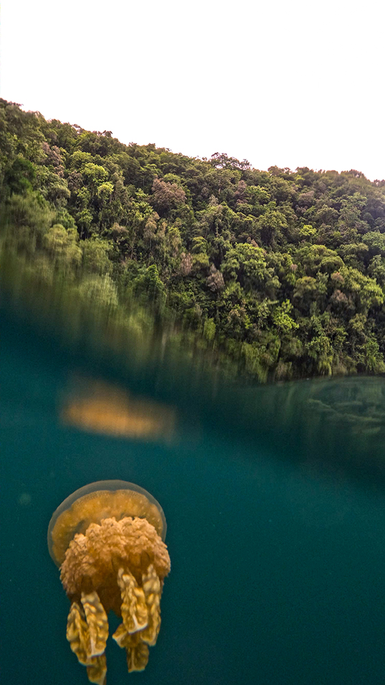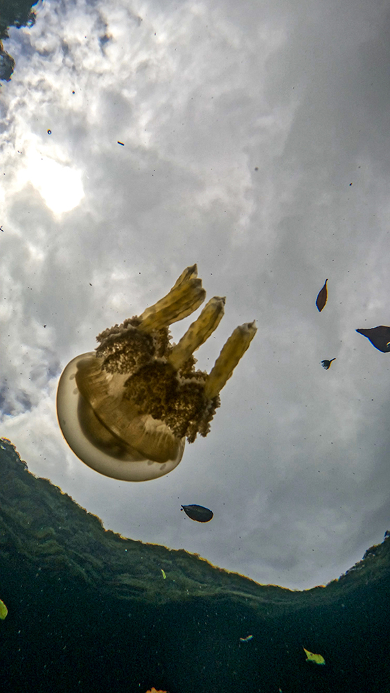 This time as we paddled, Finn started to point out a handful of golden shapes floating just under the surface of the green water. I peered over the edge of me and Vince’s kayak to find a watery vignette of the most beautiful jellyfish I’d ever seen just before it sank out of site, disappearing into the depths of the bay. It was a Mastigias Papua, a stingless, lagoon dwelling species of jellyfish whose range extends throughout the Indo-Pacific. The Mastigias Papua is a relative of the Golden Jelly, a subspecies that is found only in the marine lakes of Palau.