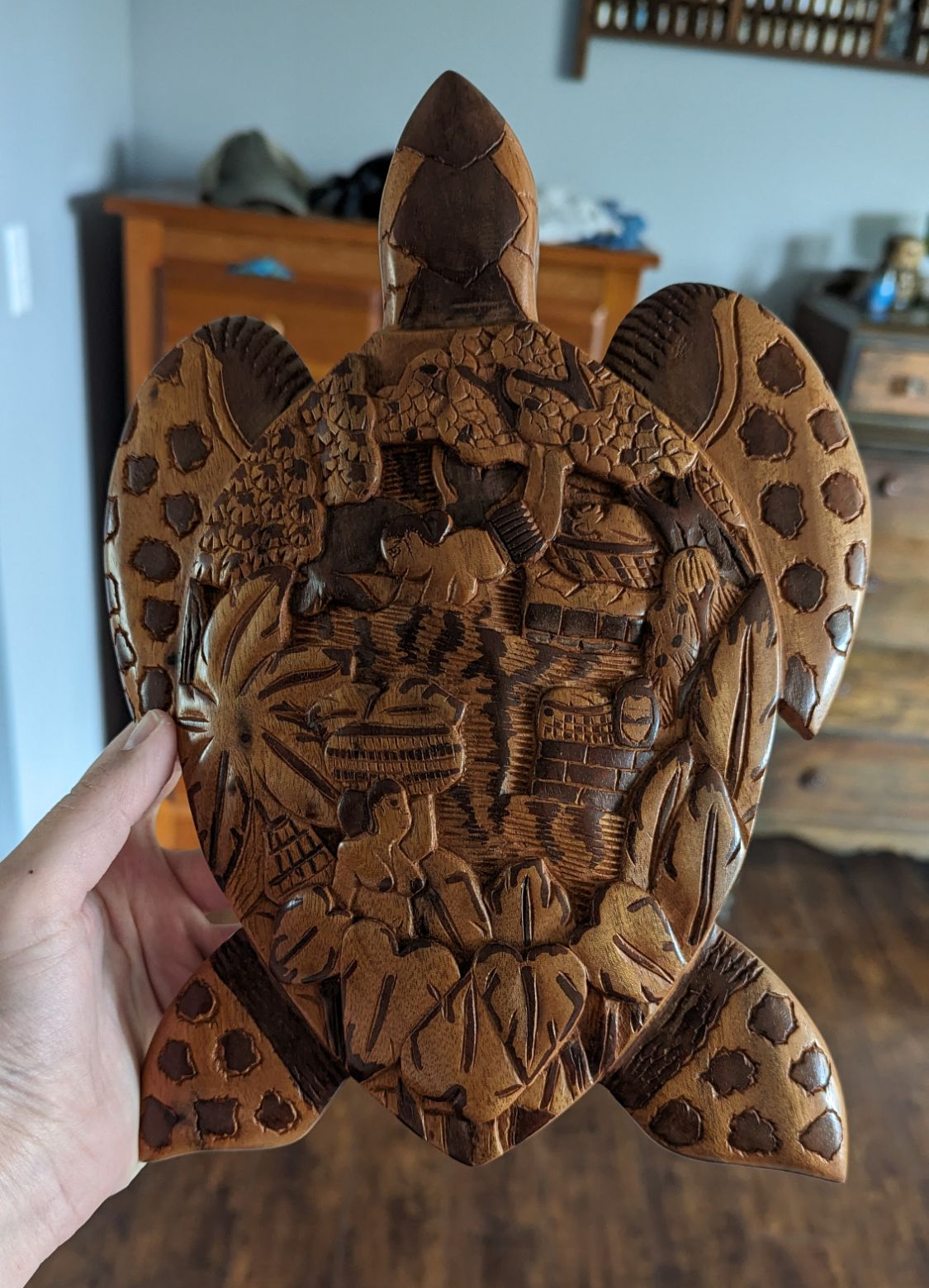 It was a short ride back to Paddling Palau’s headquarters after that. When we arrived, we said goodbye to RD, and then Finn drove us back to our hotel, stopping at a store along the way so I could buy a carved wooden storyboard. I selected a turtle carved with the legend of a young woman that turned into a dugong because she ate the wrong food shortly after giving birth to a baby. I think it’s one of the most beautiful souvenirs I’ve brought home from my travels.