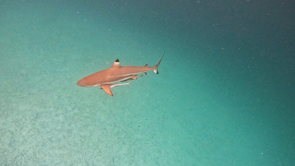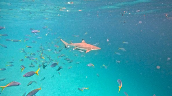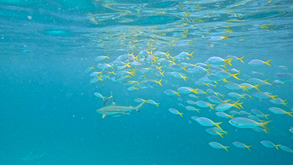 This spot was known as Blacktip Beach because the blacktip reef sharks in the area have become habituated to boats, and will swim right up when they hear one approaching. So when we jumped into the water amidst another school of yellowtail fusiliers, nobody was surprised to see a few sharks circling the area.