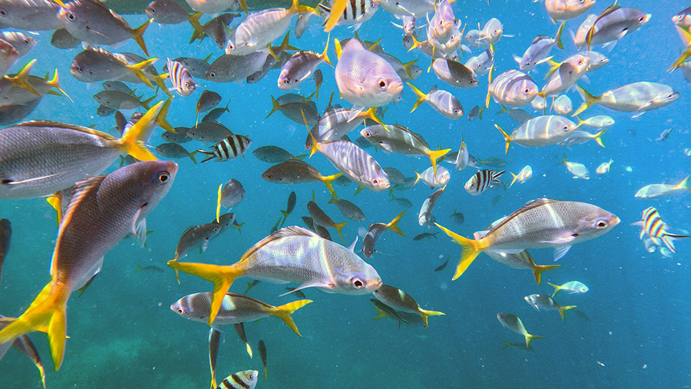 I peered into the water below us as I pulled on my fins and mask. Already, there were hundreds of fish swarming around the boat. Finn identified them as yellowtail fusiliers. Vince, Rachel, Jared and I all jumped into the water together, straight into the chaos of the school of fusiliers. There were also sergeant majors in the mix, and flashes of shining scales dazzled me as the fish surrounded us in every direction.