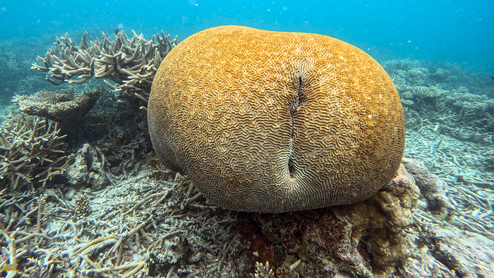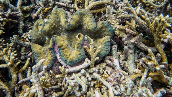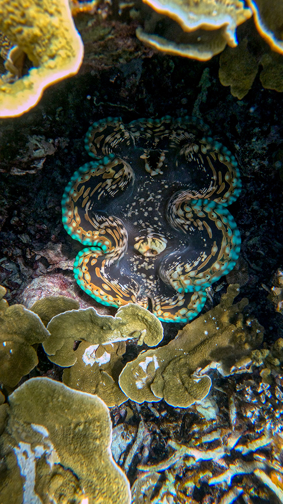 We explored the Fishbowl for a long time because there were beautiful corals and fantastic fish species to see everywhere we looked. I found a large rock that was covered in dozens of small giant clams, each with distinct, colorful patterns. I also found a school of juvenile bumphead parrotfish. They were much smaller than the mature adults we’d seen while SCUBA diving a few days earlier. Throughout the reef, we kept finding pearlescent balls, about the size of golf balls. Jared asked Finn what they were and he explained that they are bubble algae, and are one of the largest single-celled organisms in the world.