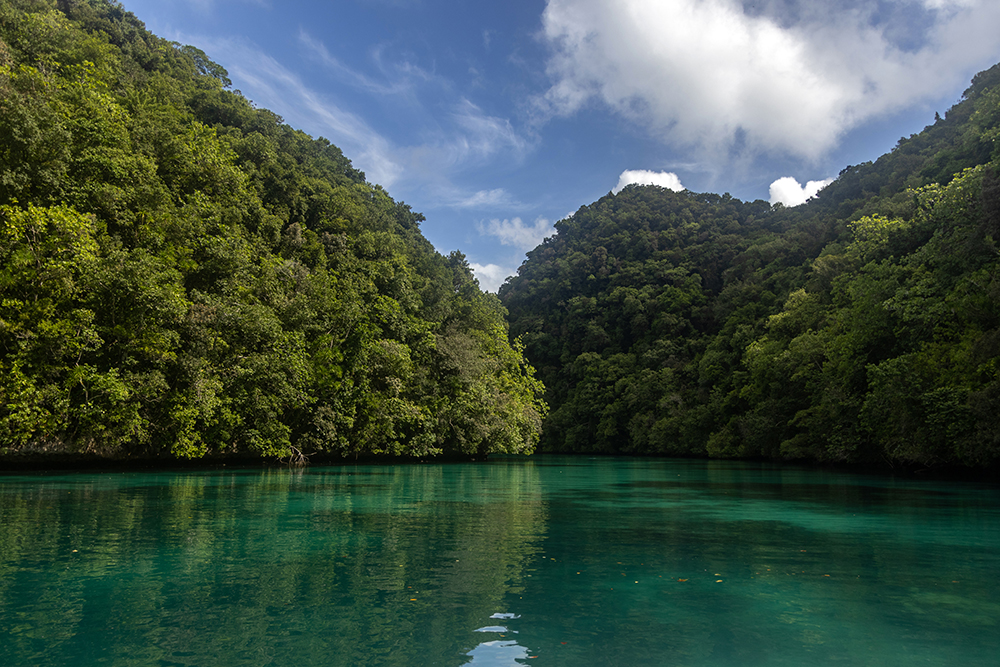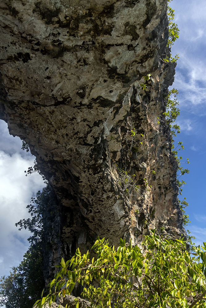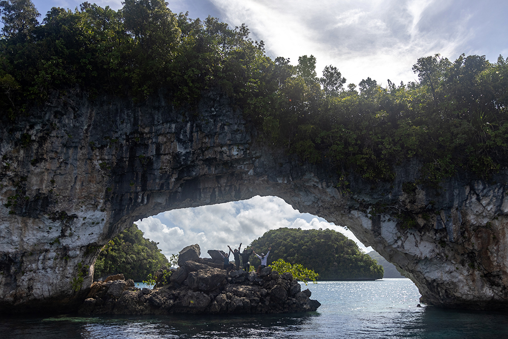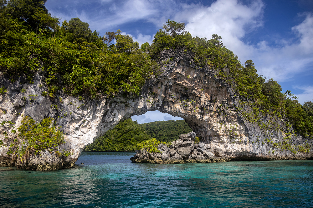 Presently, captain RD was taking us on a very scenic route through the Rock Islands as we wove our way ever closer to Mecherchar, a large island that is home to Palau’s most famous attraction, Jellyfish Lake. RD steered our little boat between a couple more small islands, and we entered an emerald green lagoon where we were completely surrounded by limestone islands. I swiveled my head around to take in the panorama as RD slowed the boat to a near stop. We were approaching a large, free standing arch that bowed up from the water in the middle of the lagoon.